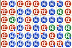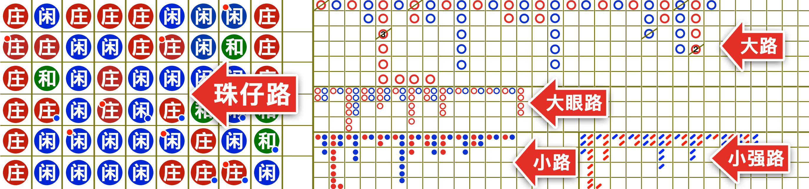 红圈为庄,蓝圈为闲,庄一列,闲一列,序排列出,如果和的话,会用一条绿色斜线代表,如果之后连续出现 和,便用绿色数字代替。
